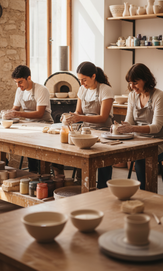Un estudi de ceràmica acollidor amb parets de pedra i llum natural. Un noi i dues noies amb davantals treballen alegrement el fang sobre una gran taula central de fusta. Al fons hi ha un forn i prestatgeries plenes de pots i peces, i en primer pla s'intueixen uns bols de ceràmica acabats.