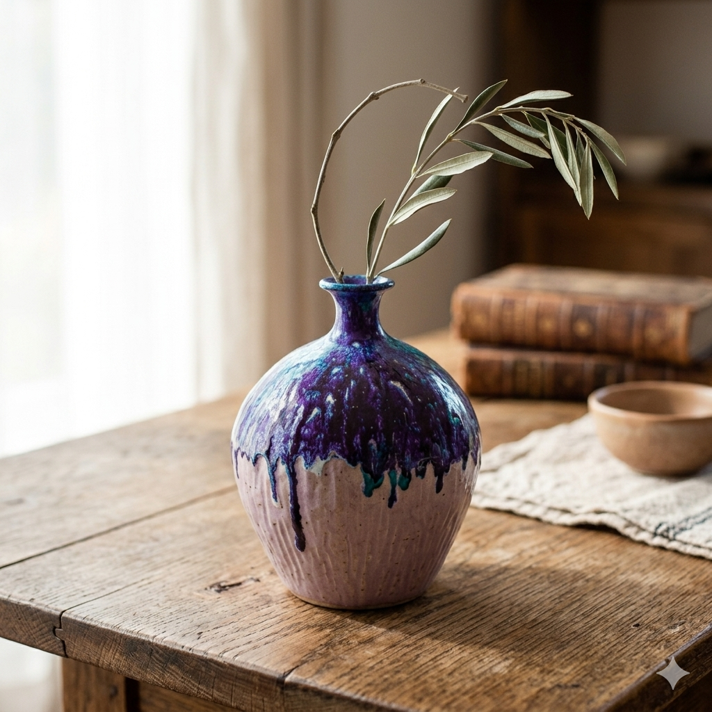 En primer lloc, aquest gerro destaca per la seva forma orgànica i la textura estriada de la base, que recorda les formes naturals del fang. D’altra banda, el que realment fa especial aquesta peça és l’aplicació de l’esmalt: una tècnica de gotejant on els tons porpres, liles i blaus elèctrics es fonen sobre una base rosa suau.